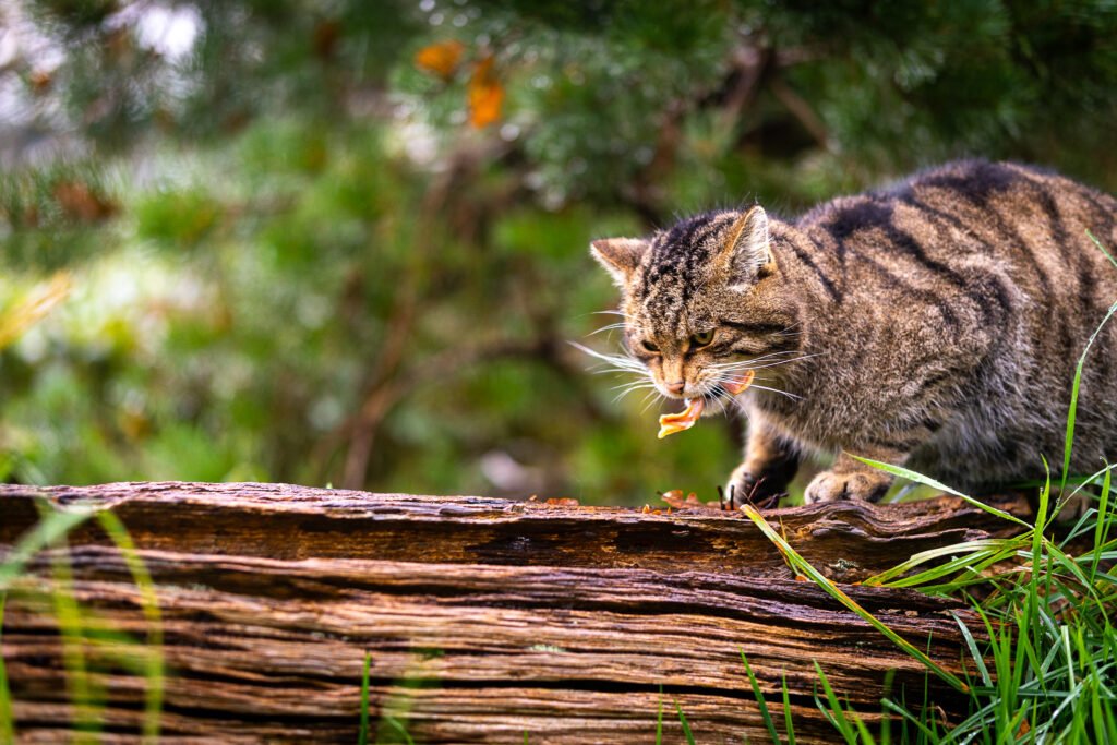 A wildcat is enjoying a baby chick at the British Wildlife Centre.